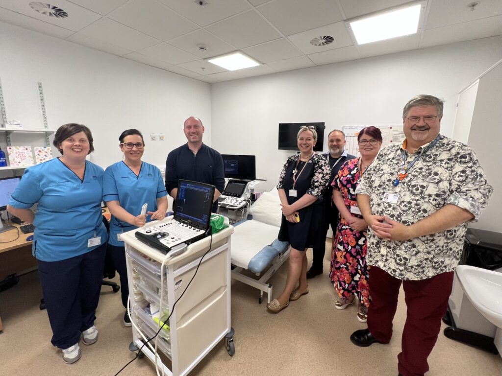 Pictured left to right: Kirsten Grieve NHSO Radiographer – Morag Gunn NHSO Lead Peripatetic and MSK Sonographer – Neil Gray Health Secretary – Laura Skaife-Knight NHSO Chief Executive – Davie Campbell NHSO Non-Executive Board Member – Debs Crohn NHSO Head of Improvement – Nick Crohn NHSO Radiology, Audiology and Echocardiography Services Manager.