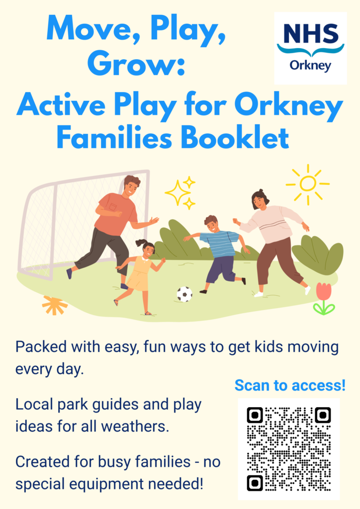 Our Move, Play, Grow: Active Play for Orkney Families Resource is designed to help parents and carers encourage children to be active every day. It’s full of practical, fun ideas and activities that make it easy to include movement and play in your family’s daily routine, whether you’re indoors or outdoors.